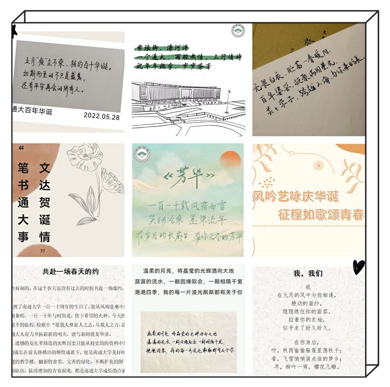 其中,在三行情书主题创作比赛中,秘书201胡晓楠获一等奖,秘书201林晓雯等三名同学获二等奖,中师201梅鑫雅美等七名同学获三等奖,中师193史若彤等17名同学获优秀奖。他们借创作向母校表达真挚的情谊,送上最美好的祝愿,激发出浓浓的爱校荣校之情。主题征文比赛中,同学们真情抒写恩师风范、同窗情谊、师生情谊,抒发对通大深情的祝福,最终研20中文学硕沈雨晴《共赴一场青春之约》获一等奖,中师定向191周心远《百又十年芳华诞,献礼通大筑梦圆》、研20语文专硕项诚《我,我们》获二等奖,秘书211王妮楠《永恒的青春》、历师212杨紫瑜《心里话 话通大》,研21中文学硕孙蕊《请党放心,强国有我》获三等奖。
