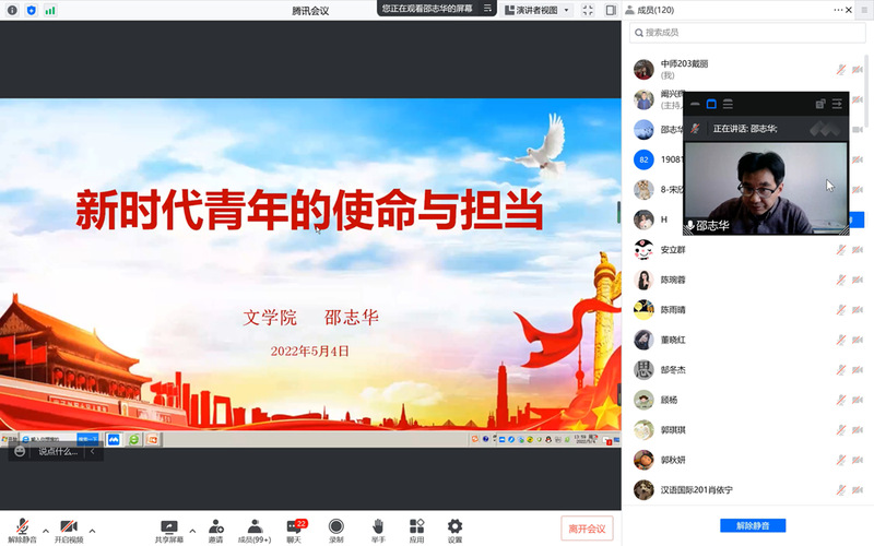 适逢五四青年节,5月4日下午,williamhill威廉希尔通过腾讯会议举办“新时代青年的使命与担当”专题党课教育。本次党课由williamhill威廉希尔党委宣传委员邵志华教授主讲。